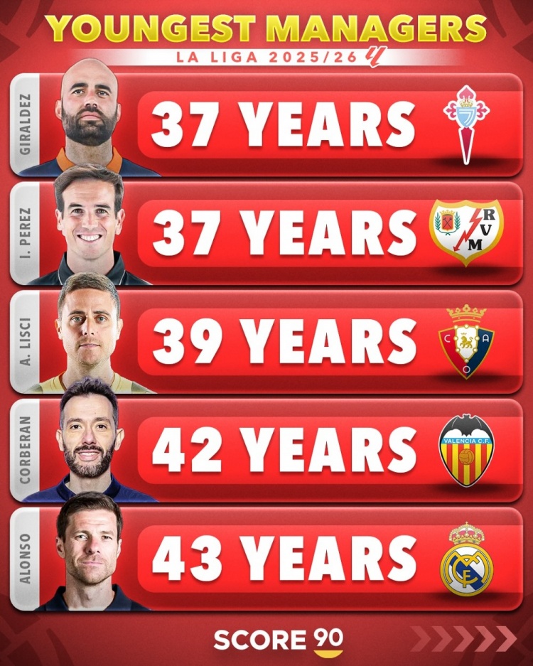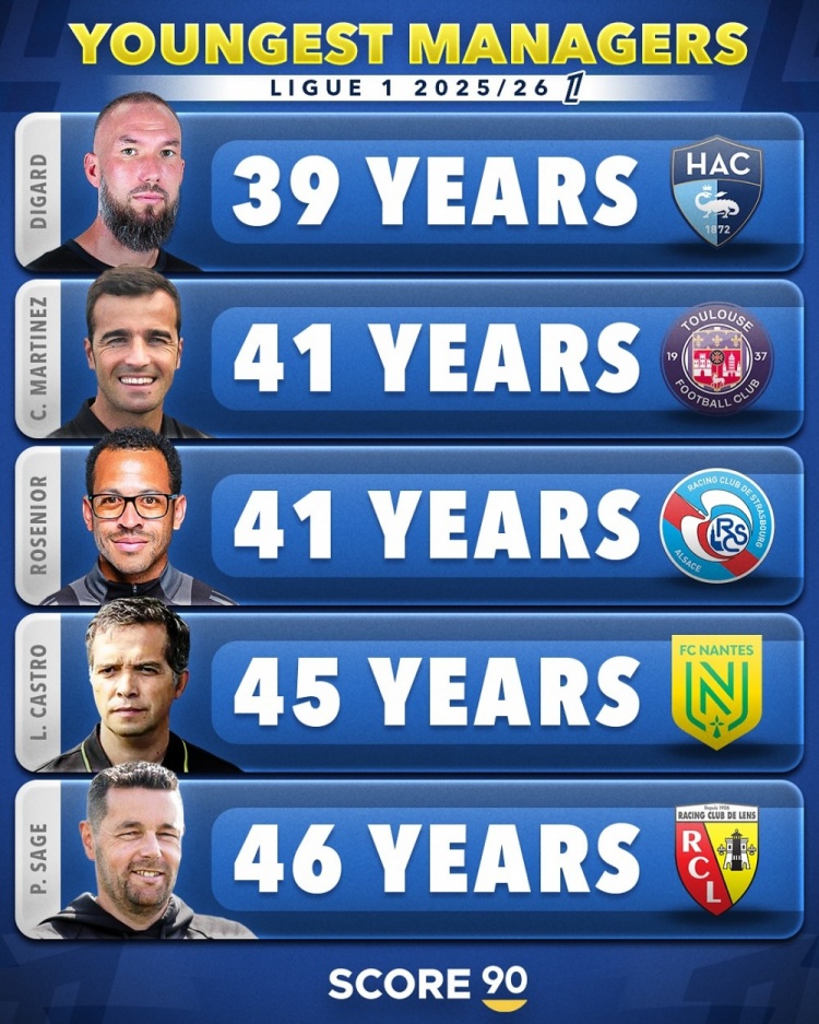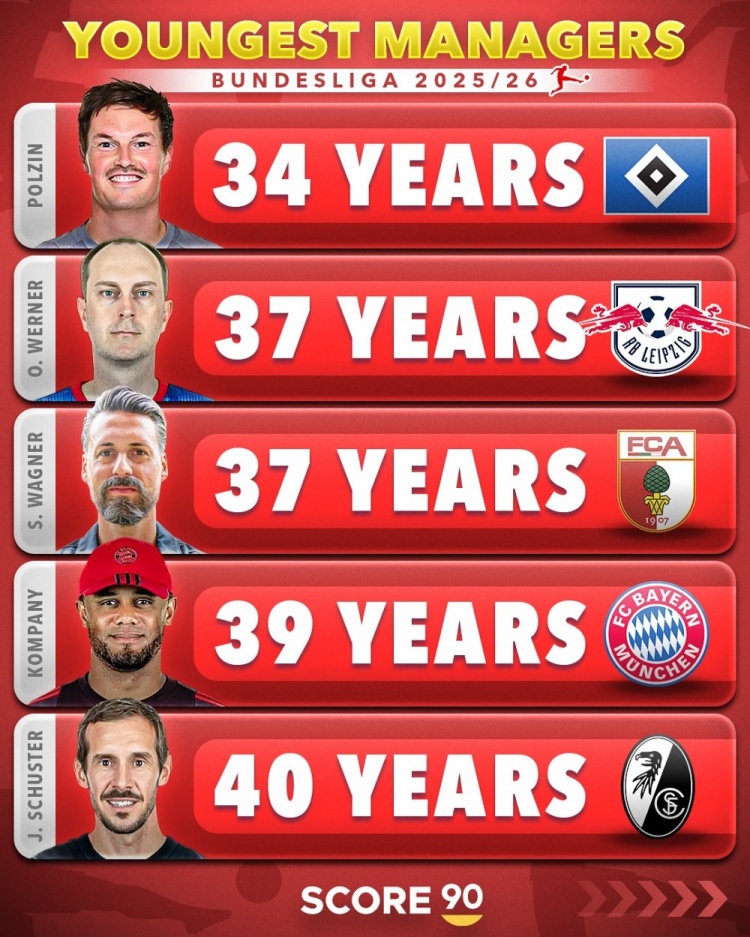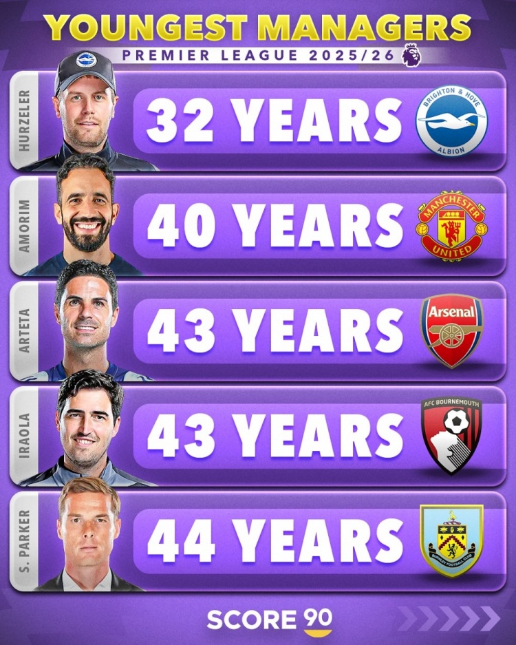8月17日讯 Score90统计了五大联赛球队在任主帅的年龄,并按照不同的联赛列出最年轻主帅排名。